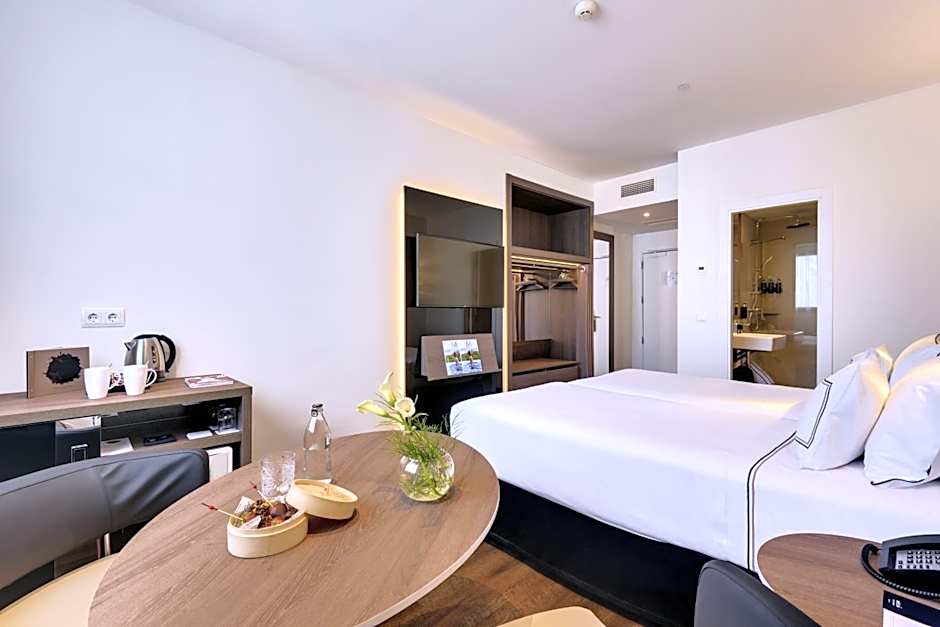 This premium room features elegant decor and modern furnishings. It offers views to quiet interior courtyard. This room comes with a double bed or 2 single beds (subject to availability). The room comes with a table and seats and a complete bathroom with shower, superior quality amenities and MP3 with Bluetooth and Nespresso coffee maker.